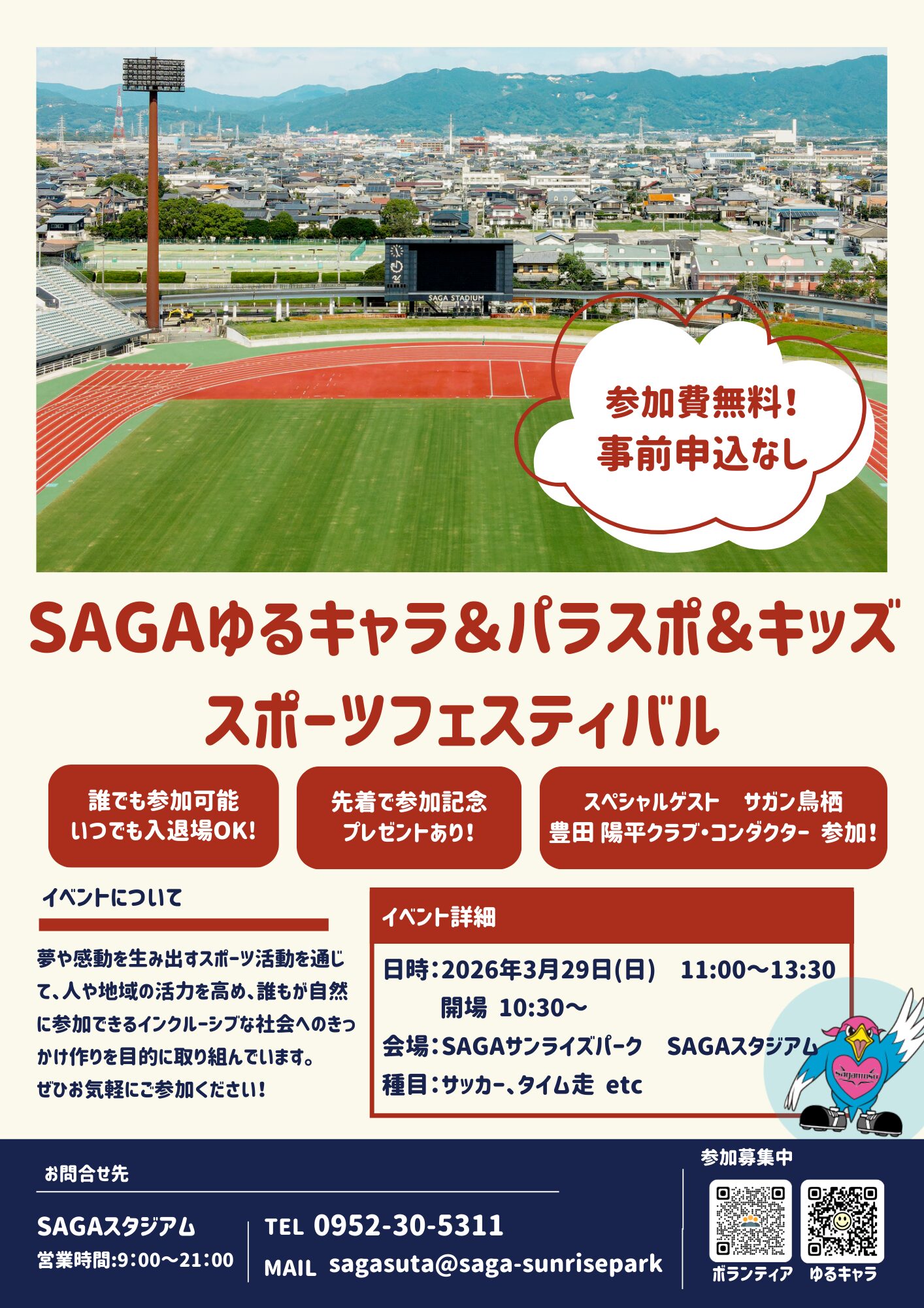 この度、2026年3月29日(日)、SAGAスタジアムにて「SAGAゆるキャラ&パラスポ&キッズスポーツフェスティバル」を開催いたします。