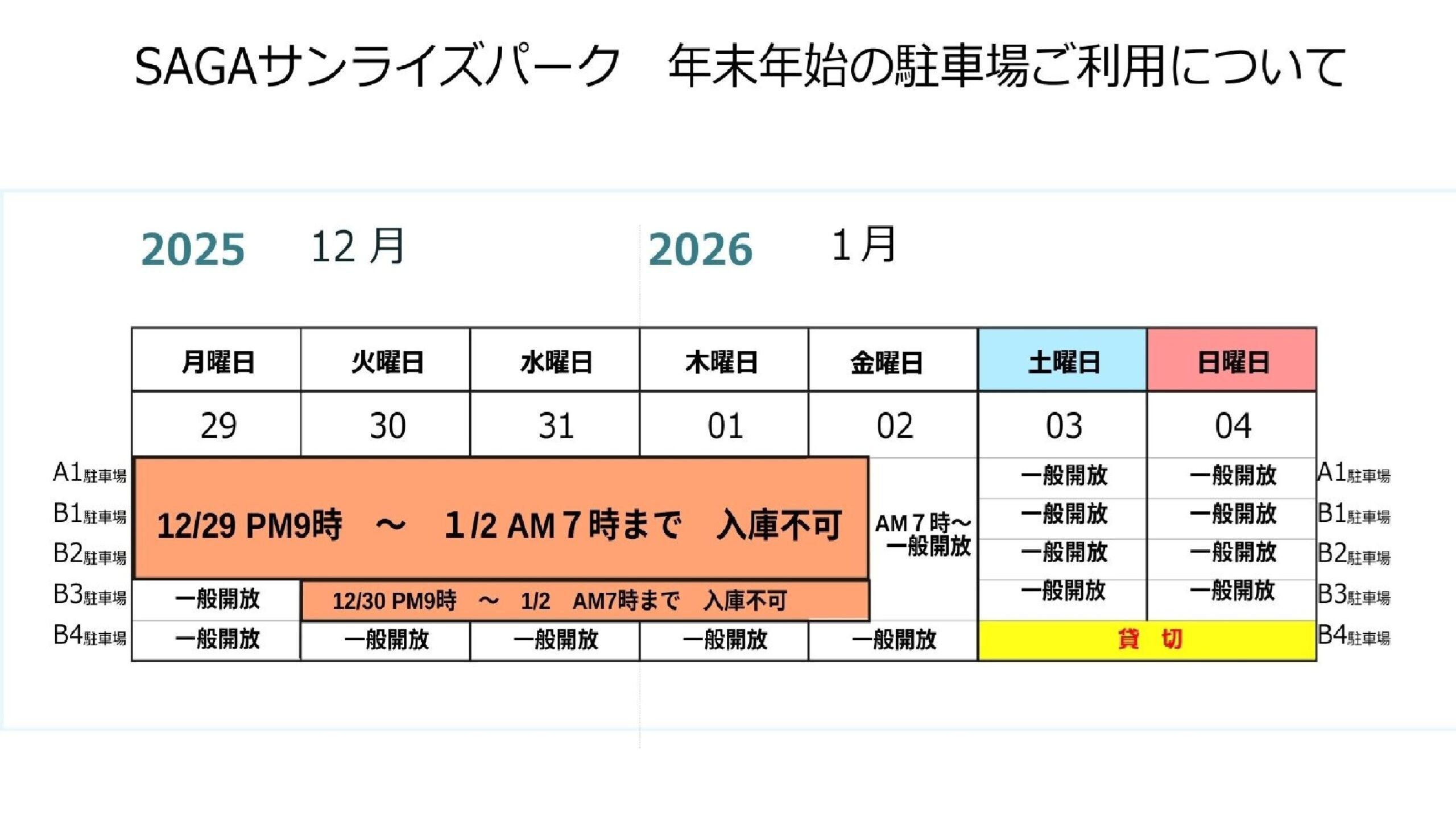 SAGAサンライズパーク 年末年始の駐車場ご利用について